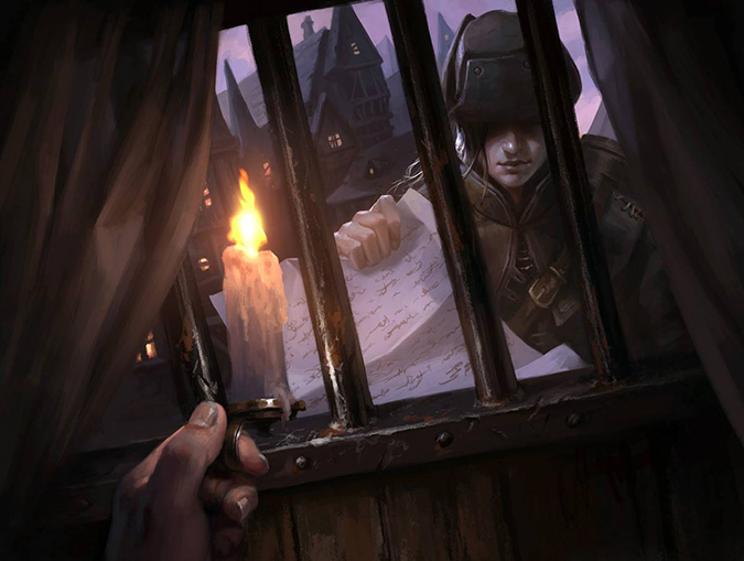We see Jace finding clues and adding evidence together. Jace is our Sherlock Holmes, and we are more of a Watson, nodding at the findings. We’re tagging along on the mystery and actively encouraged by community-engagement efforts and the Hanweir Chronicle to participate. The art descriptions wax and wane between conceptual like Trail of Evidence and John Avon’s Clue token and scenes like the following: