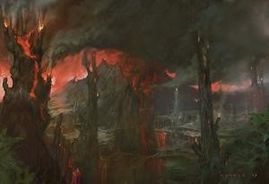 Each of these artworks doesn’t show one of its colors. There are no trees in a caldera, and a cavern has no plains—or grass for that matter.