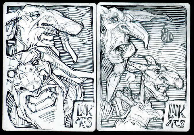 Since Nils has the side-event play mat, I receive some access to have his early sketches. Check them out—they’re pretty neat: