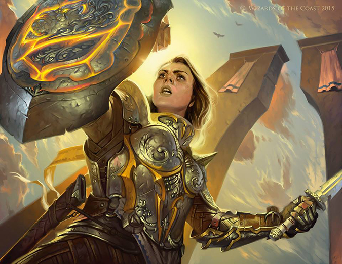 While the Women Fighters in Reasonable Armor blog hasn’t been updated in a while, if it were, this piece would be included. Victor shows us a likeness of Maisie Williams, who is Arya in the Game of Thrones TV series. What I see is a badass warrior woman in armor that makes sense and has filigree and ornamentation—which I’ve suggested as a way to show a woman in armor—and there’s beautiful usages of gold throughout the piece to connect with the mana color of white, purity, and the light source.