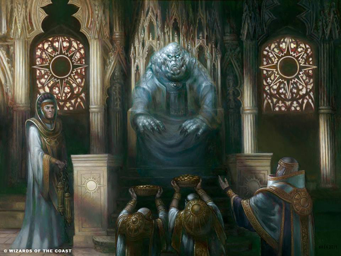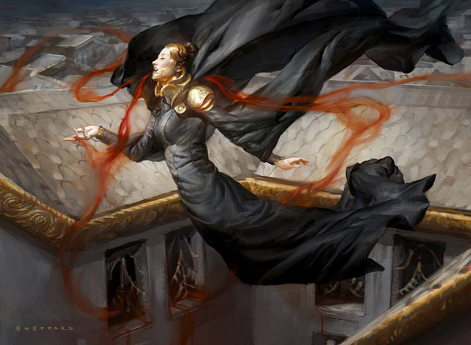 Baga’s work is characteristic with his usage of light and figural work. He looks like himself, and his apprenticeship under Donato Giancola, a living master, shows through every major painting he receives as a commission. Painting delicate golden texture, cloth, and marble all interact differently, but he then adds a ghost to the scene, and it feels incorporated into his view of the world of Ravnica. I’m not an Orzhov person, but if I were, this is a snap-buy painting.