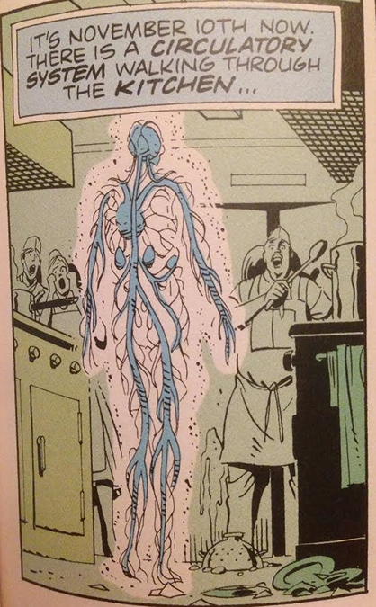 I can’t unsee Dr. Manhattan here being reconstructed from The Watchmen movie. The graphic novel looks different. In case your hipster friend you show this article to asks, I included the original depiction as well below.