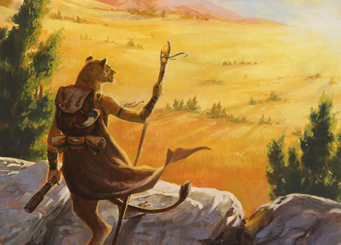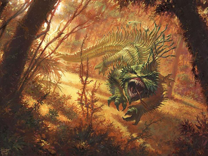 Ralph doesn’t get many beasts working for Magic—he’s only gotten Terra Ravager and this feisty little guy. What is showing through is his work on Wildborn, makin’ just beautiful paintings of landscape scenes. This state-park camp scene has great fauna that he filled with a little guy defending his weird Jund forest.