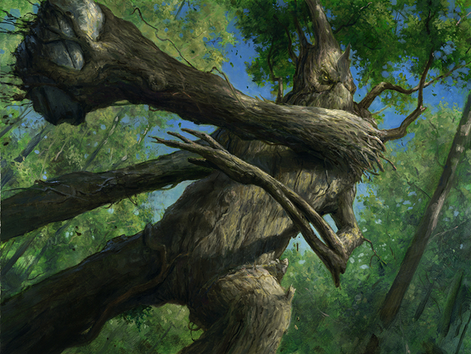 Regardless of Steve’s memory, the background leaves in this are so delicately painted—you look in front and then behind when you see just how intentionally Steve used an abundant amount of shadow on the treefolk to keep focus forward. I bet his reference was mega-fun to play with: a tree holding a giant boulder, preparing to lob it at a nearby foe.