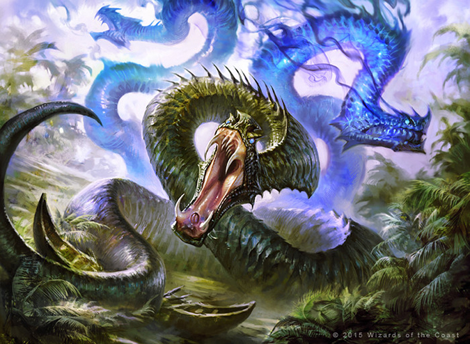 This is some of Dan’s early Magic work, and he had a tight control of scenes by showing the figures more and more in focus. There was no need to make ten snake warriors in the trees, despite many efforts in the past that mechanically tied art to the card. Thank god they didn’t go that route, and kudos to the design team for including tokens of cards that players definitely need in their deck.