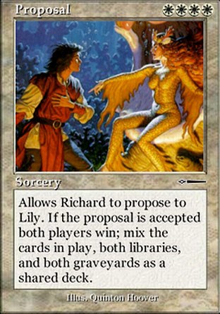 White isn’t about the unnecessary. It sets rules and taxes folk mechanically, such as with Land Tax. A ring is required, sure, but some level of proposal is absolutely necessary. Baseball game jumbotron proposal? Yeah, the proposed-to person won’t say “yes” to save face. It’ll be a “no,” and you’re single again, homie.