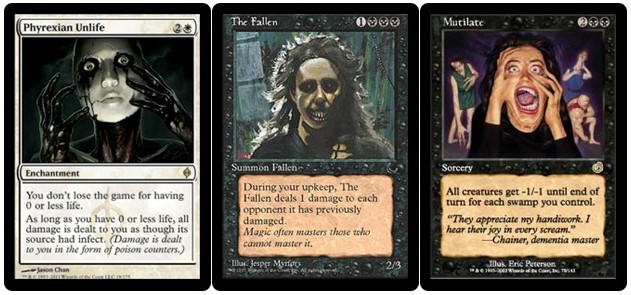 Phyrexian Unlife has that pretty/creepy anime thing going on. Contrast that with the almost kitschy, ’70s bizarro feel of Mutilate. Though the poses of the (main) subjects are so similar, the arts emote so differently: loneliness versus insanity. The Fallen has a gritty feel that I love—very Heath Ledger’s Joker.