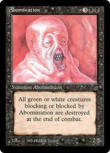 While I admittedly have a weak stomach when it comes to violence in media (especially visual), I can still appreciate the artistic merit of the dark, gruesome, dangerous, and horrific. The rich colors, contrasts, strong lines, and intense shadow common to “scary” art appeal to me, even if I can’t directly look at cards like Sensory Deprivation. Thanks in large part to my awesome Twitter followers, here are some of the most killer images in Magic.