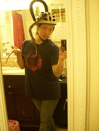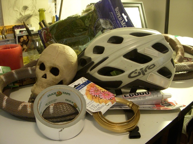 Duct tape is the name of my game. I am pleased to find that the first snake attaches easily to the bike helmet. Dismayed to find the gauge of wire I purchased is not strong enough to use as sculpting form for the rubber snakes . . . have to come up with solution leveraging just the duct tape.