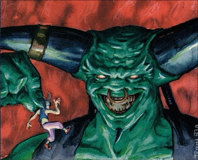 Furious, the woman summoned a large demon to her side, its scaled body covered in glowing demonic runes. The demon crouched beside her and whispered into her ear before flying off and driving its clawed hand through the green planeswalker’s gut. The demon circled around and landed beside the woman, licking the entrails from its menacing talons.