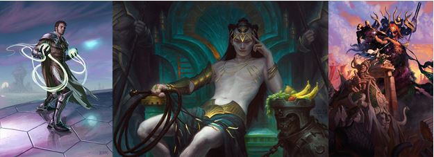 From left to right: Venser, the Sojourner; Tasigur, the Golden Fang; Xenagos, God of Revels.