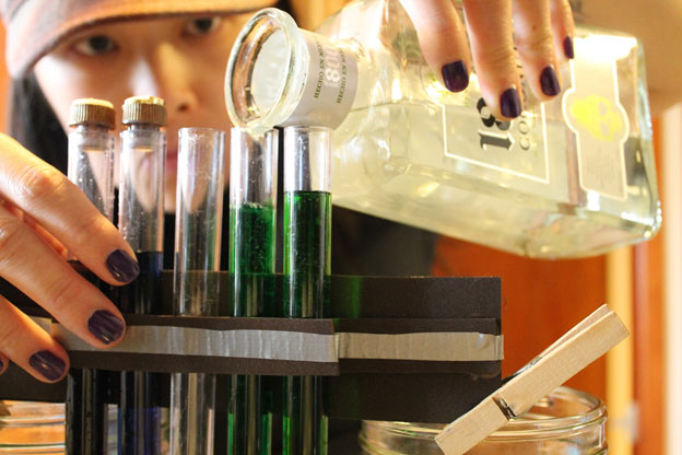 Added another strip of craft foam on top of the test tubes. Put a drop of food coloring in each tube, and like a wino, decided to add tequila as the liquid.