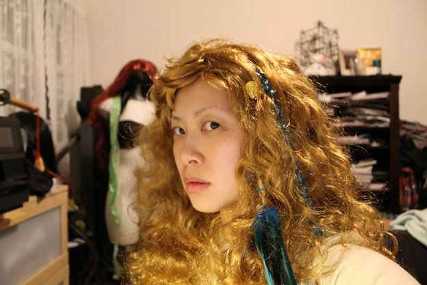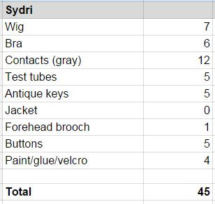 Focused on crafting for this cosplay, I knew there were a few items I wanted to make sure to get right: Sydri’s forehead-brooch thingy, her arm test-tube gauntlet apparatus, the steampunkish pauldron-gears set, and the lacy blue bustier-as-shirt. Sydri also has really big hair.