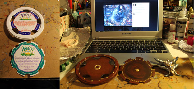 Sydri’s gear flair is actually quart-size yogurt lids that were cut, painted with acrylics, and detailed with puff paint. Her forehead brooch was sculpted with Fimo.