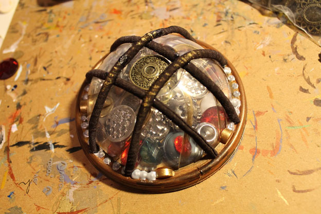 Glued buttons and rhinestones to a cardboard base that also had a hole in the center for an LED. The “metal” grid on top is made from repurposed bikini straps. Acrylic and puff paint detail.
