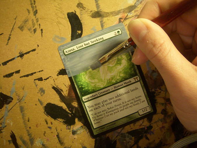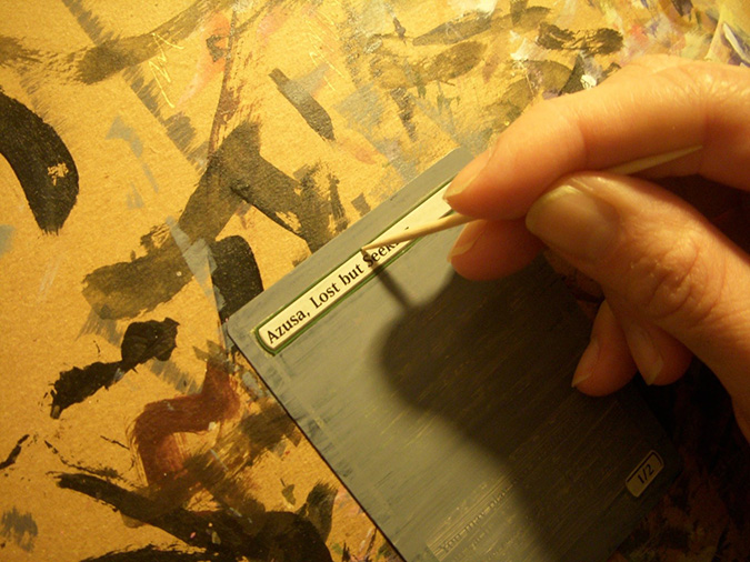 Always check for areas that need tooth-picking after you apply a layer—don’t wait until the end, when you have hard, thicker paint to scratch off. Tooth-picking is the cleanup of card altering. Gently scratch away paint that has escaped into places it shouldn’t be.