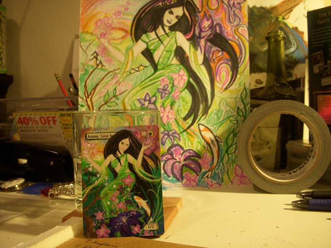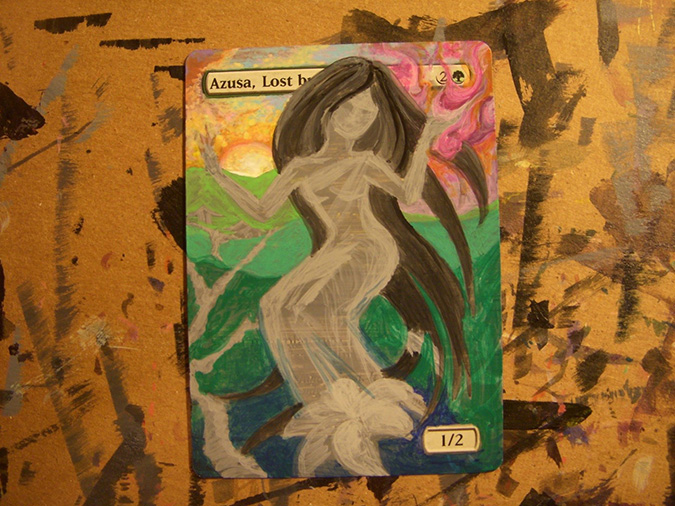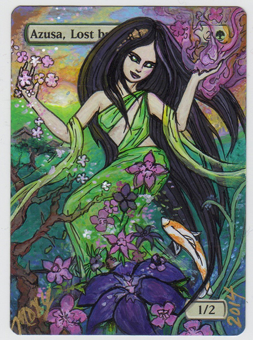 Hurray! A unique take on Azusa, from scratch. Right up my alley. Plus, Azusa is such a badass lady in both Modern and Commander. I’d done an Azusa extension before and really enjoyed it—jumping in and swimming naked in the warm waters of her effulgent green fire and all that—but I’d never done an Azusa full art. My next move was to e-mail Joshua with a few questions that would help me develop his concept.