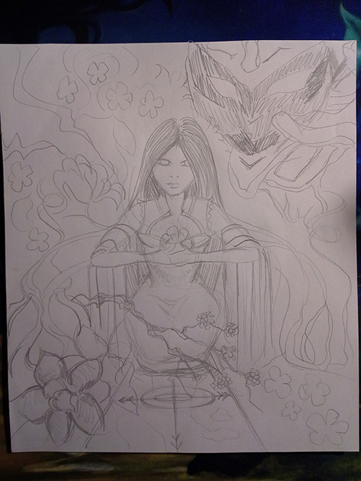 This is the final level of detail I had before I started inking. You can see the addition of the cherry blossoms in her right hand and the improved ball of flowery purple flame in her left. On to ink!