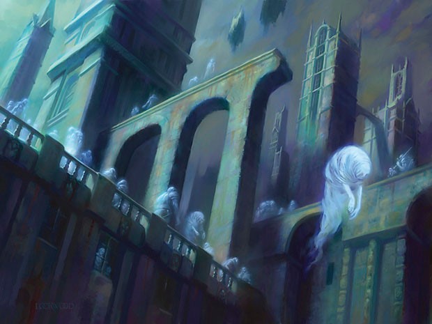 The two Wojek specters flew from the balcony just as the sun rose above Ravnica, casting Agyrem in shades of canary and peony.