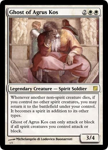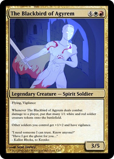 At first, my card was called Agrus Kos, Spectral Commander. I changed it to further evoke how much Kos has been through; I wanted his title to reflect both his current position and also the fact that he is now a different sort of enforcer. As "The Blackbird of Agyrem," not everyone realizes who he is, similar to how the Blind Seer card is Urza. As a Spirit, flying was a shoo-in for an ability, and vigilance also fits his title to a T. It was then a matter of showing how he rallies support in his quest for justice. When Agrus Kos strikes, it's a sign for his men to mobilize and support their leader. Being around him then inspires them and gives them Holy Strength thanks to his angelic affiliations, as well as making them a little more vigilant about potential wrongdoing. And, of course, for the flavor text, I thought for a while about some inspirational quote of Kos's, but I then decided that his bravery and skill speak for themselves—why not show a secondhand account of how much his reputation echoes throughout Ravnica? And forgive me, but I couldn't resist the pun about geists, even though it's Innistradian terminology.