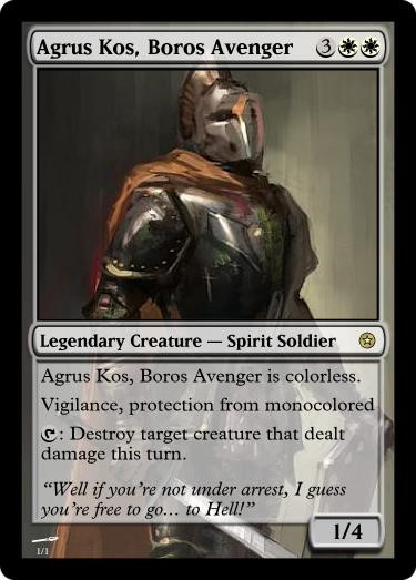 Design-wise, I decided to focus on Agrus as a spirit in the ghost quarter. He's still Boros, through and through; he's just dead. Obviously, this would make him a Spirit.