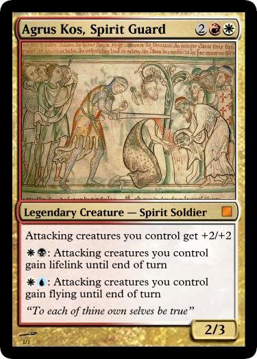 After reading the provided material (paying special attention to the wiki references and the Retribution story), I decided to make him a combat-oriented white Spirit creature. Since Agrus seems to have been an honorable and combat-skilled character while alive—and posthumous as well—I felt that he had to have both: a proactive and a reactive way of dealing with the battlefield. Also, making him a low-costed creature in mono-white, granted him to be usable in a weenieesque strategy as well has being able to hose other similar decklists in case of landing during an unfavorable match (Caltrops rework intended). The low cost also represents his new sort of incorporeal type. Agrus seems to have a rooted sense of comradeship, which I've tried to evidence in the way that both of his triggered abilities care about fellows’ interests from a flavor perspective. Finally, I should confess that I really wanted to keep the flavor text the first versions of the card had, but adding that third activated ability became a must.