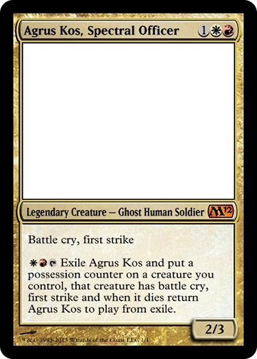 After reading the Agrus Kos lore, I noticed that he has the ability to possess other beings. I used this piece of lore to inspire his possession ability. The possessed creature has battle cry and first strike because I thought they were the most applicable abilities for a Wojek leader to give.