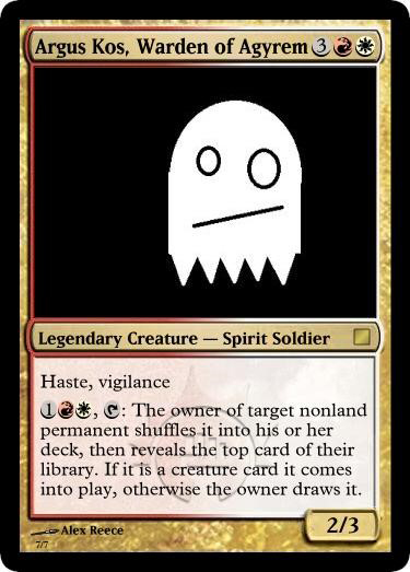In terms of power level, he seems well-fitted to Commander or a build-around-me casual deck with many Spirits. I'm not overly concerned about the aggressive casting cost because, while he can grow at instant speed, he requires a full graveyard to do so. On the Agyrem plane, he initially looks worse since the graveyard is empty, but not so: You can exile your opponents' creatures in response to the plane's trigger, so opponents don't receive their creatures back while you do.