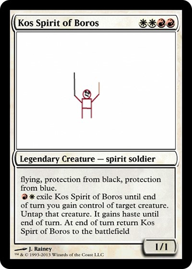 My card was named for Kos’s position as a ghost and his loyalty to Boros. His mana cost reflects his twice-over commitment to the Legion: 2 mana of each of the Boros types, one for his service both in life and in death. I made him a Spirit, because that is the traditional type for white ghosts, and a Soldier, since that is what he is in life and in death. He has flying since, as a Spirit, he is shown flying in the story, and he also has protection from blue and from black for story reasons. Blue and black being the Dimir colors, Kos killed several Dimir agents in Retribution in Ravnica and would hold a grudge against Dimir for what they did in the original Ravnica block novels. His ability costs red and white mana because it reflects the two colors—white in that he exiles himself and returns at end of turn and red in that he is effectively acting like the red instant Act of Treason. I chose to model his ability after Act of Treason because it is a red instant from the Return to Ravnica block, and I felt that the ability to take over an enemy creature would match his ability to possess people in the novels.