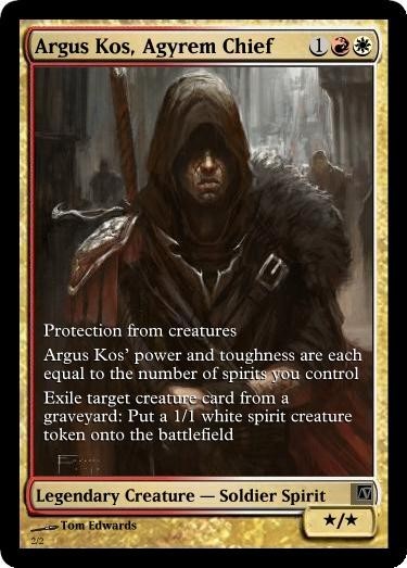 Again, loved the effort to illustrate here. Zengardon wrangled permission to use this great art by Tom Edwards. The piece is gritty and dark, and it speaks to the haunted side of Kos, which is a very real part of his character. I also like the card title—it’s simple and local, noting Kos’s new jurisdiction and title, and it shows a logical evolution from his first incarnation, Wojek Veteran. I think the card mechanics illustrate Kos’s ghostly community-minded identity, and I enjoyed that the last ability seemed to reference the recruitment part of Kos’s job.