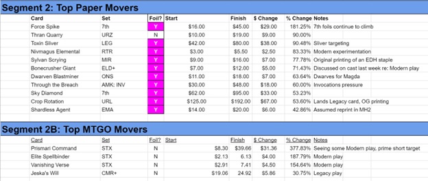 Your hosts recount the price motion on paper cards again this week including Shardless Agent, Sky Diamond, Through the Breach, Bonecrusher Giant, and Force Spike.