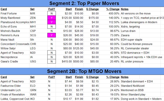 Your hosts recount the price motion on paper cards including Final Fortune, Misty Rainforest, Planebound Accomplice, Echo of Eons, Mishra's Bauble, Pemmin's Aura, Willow Satyr, and Necropotence.