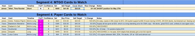James & Travis shift gears to talk over cards that may see an uptick within the next few months in both paper and online, including a forward looking Teferi, Time Raveler short on MTGO, and a solid slate of paper options for the longer term.