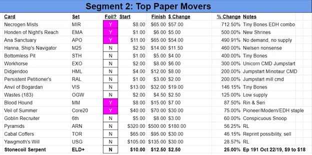 Your hosts recount the price motion on paper cards including Necrogen Mists, Ana Sanctuary, Bottomless Pit, Workhorse, Cabal Coffers, and more.