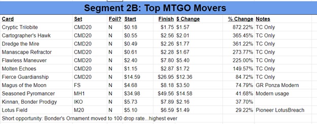 Over on MTGO the guys note the upward momentum of the Commander 2020 cards, Magus of the Moon, Seasoned Pyromancer, Kinnan, Bonder Prodigy, and Lotus Field.