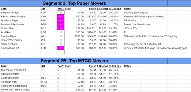 Your hosts recount the price motion on paper cards including Ethereal Forager, Munitions Expert, Notion Thief, Ernham Djinn, and Shark Typhoon.