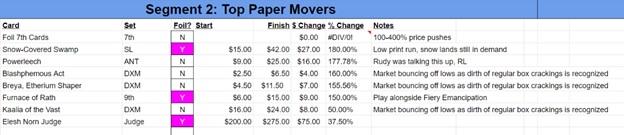 Your hosts recount the price motion on paper cards including foil 7th cards, Secret Lair Snow-Covered lands, Breya, Etherium Shaper, Blasphemous Act, and others.