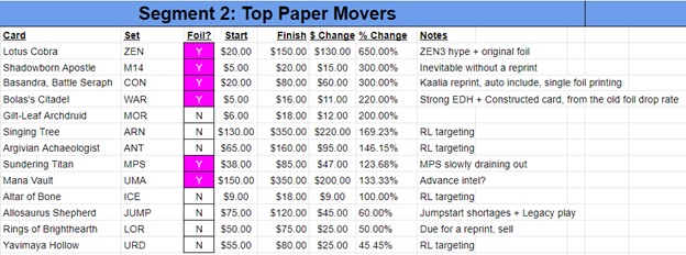 Your hosts recount the price motion on paper cards again this week including Yavimaya Hollow, Rings of Brighthearth, Altar of Bone, Gilt-Leaf Archdruid, Bolas's Citadel, and Lotus Cobra.