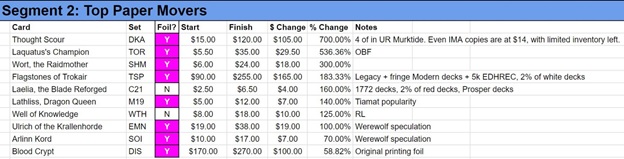 Your hosts recount the price motion on paper cards again this week including Blood Crypt, Arlinn Kord, Ulrich of the Krallenhorde, Lathliss, Dragon Queen, Flagstones of Trokair, and Thought Scour.