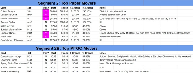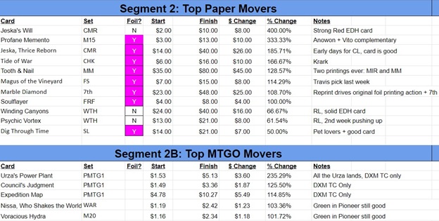 Your hosts recount the price motion on paper cards again this week including Jeska's Will, Profane Momento, Jeska, Thrice Reborn, Magus of the Vineyard and others.