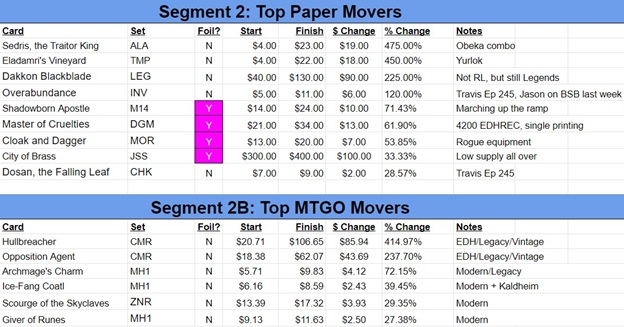 Your hosts recount the price motion on paper cards again this week including Sedris, The Traitor King, Eladamri's Vineyard, Overabundance, Cloak and Dagger, and others.