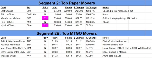 Your hosts recount the price motion on paper cards again this week including Last Chance, Stitch in Time, Muddle the Mixture, and Mystical Tutor.