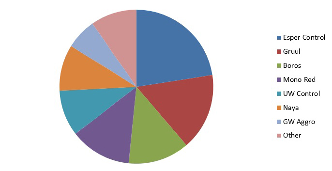 This past weekend, all eyes were on Worcester for a taste of what the Standard metagame would look like in the coming months. As it turned out, the top decks were a mix of blue-based control, red-based aggro, and a smattering of green-based midrange. Here’s what the breakdown of the Top 32 decks looked like: