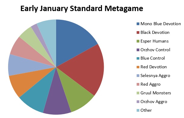Standard season is upon us, and I’ve been keeping myself busying poring over all kinds of decklists (amongst many other things). The format has evolved considerably since my last review, although Mono-Black Devotion and Mono-Blue Devotion still reign supreme through sheer numbers. New challengers have arisen; in particular, Esper Humans and Orzhov Control have been taking up larger shares of the metagame. Let’s look at a snapshot of the Top 16 decks from the first couple weeks of Magic Online Premier Events in January along with the last two StarCityGames Opens.