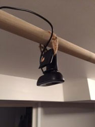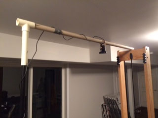 For approximately $4 in additional parts, I constructed the attachment in Figure 2. It’s a one-inch PVC T-junction affixed to the light pole with an eight-inch section of PVC piping. Coming out the horizontal is a one-inch dowel that the camera can be secured to, suspended over the play area, as in Figure 3.