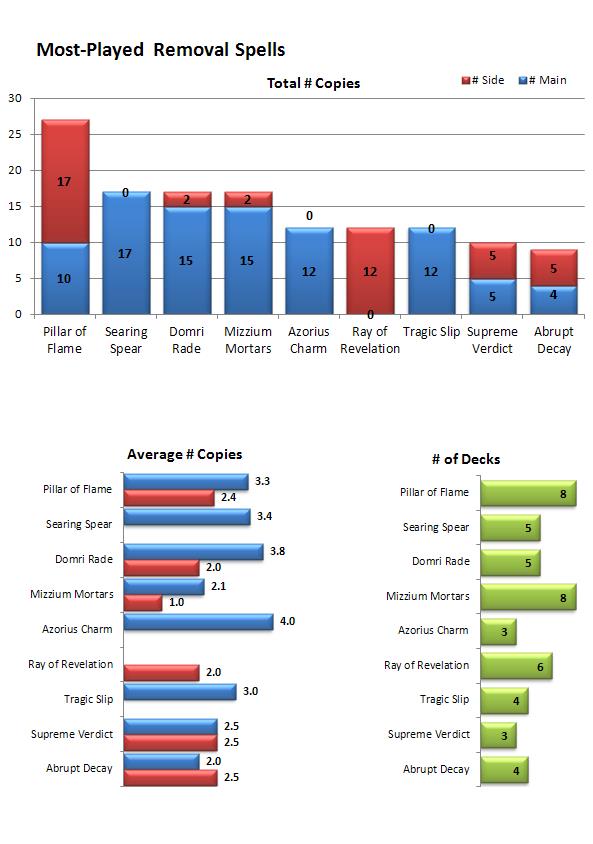 Domri Rade was a popular card this week, providing aggressive creature decks some removal through his second ability. Check out the top removal breakdown by archetype: