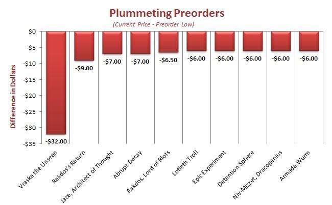 The Avg $ Diff column is the average difference in dollars between the Current Price and Preorder Low. Most cards, forty-four out of sixty-eight (65%), have a relatively minor price difference: somewhere between plus and minus $1.50. There are some rather large differences as well, however. Let’s look at the biggest drops in price from Preorder Low to the Current Price.