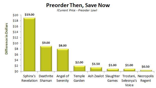 Sphinx's Revelation was ready to draw you cards and gain life for a mere $6 for the majority of the preorder season. It sells for $25 now and is a staple of the Standard metagame. Trostani, Selesnya's Voice had a much shorter window to turn its $16 profit. It started as a $4 preorder and steadily rose to a $20 high for under a week right after the release.