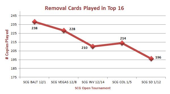 Removal is on the decline in the top sixteen decks of SCG Open Series tournaments. The total number of removal cards played has dropped by over forty between SCG: Baltimore on December 1, 2012 and SCG: San Diego. A primary reason is that there are fewer control decks, and another reason is the rise of Naya midrange decks, which have more limited card options for direct removal and rely more on creature abilities and battlefield attrition to get rid of opposing creatures. Take a look at the trend in removal cards in the following graph.