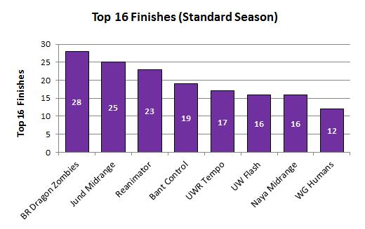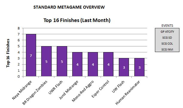 The following graphs track the deck archetypes with the most Top 16 finishes in major Standard tournaments. The top graph shows results in the last month, and the bottom shows results since Return to Ravnica rotated into the format in October of 2012.